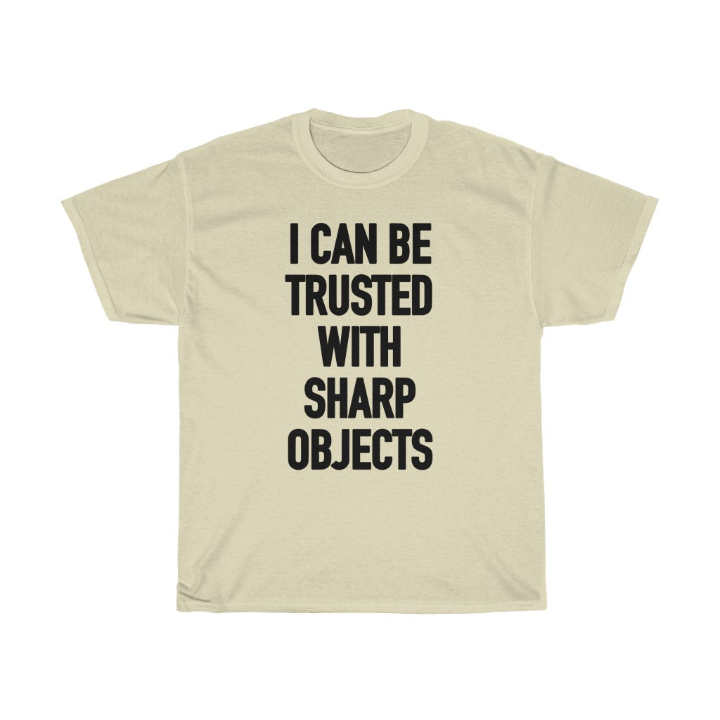 Embrace the humor with our 'I Can Be Trusted with Sharp Objects' tee, a hit among those searching for witty shirts and quirky confidence. Perfect for chefs, DIY enthusiasts, and anyone with a sharp wit and a penchant for humor. Add this conversation-starting piece to your collection and showcase your playful edge!