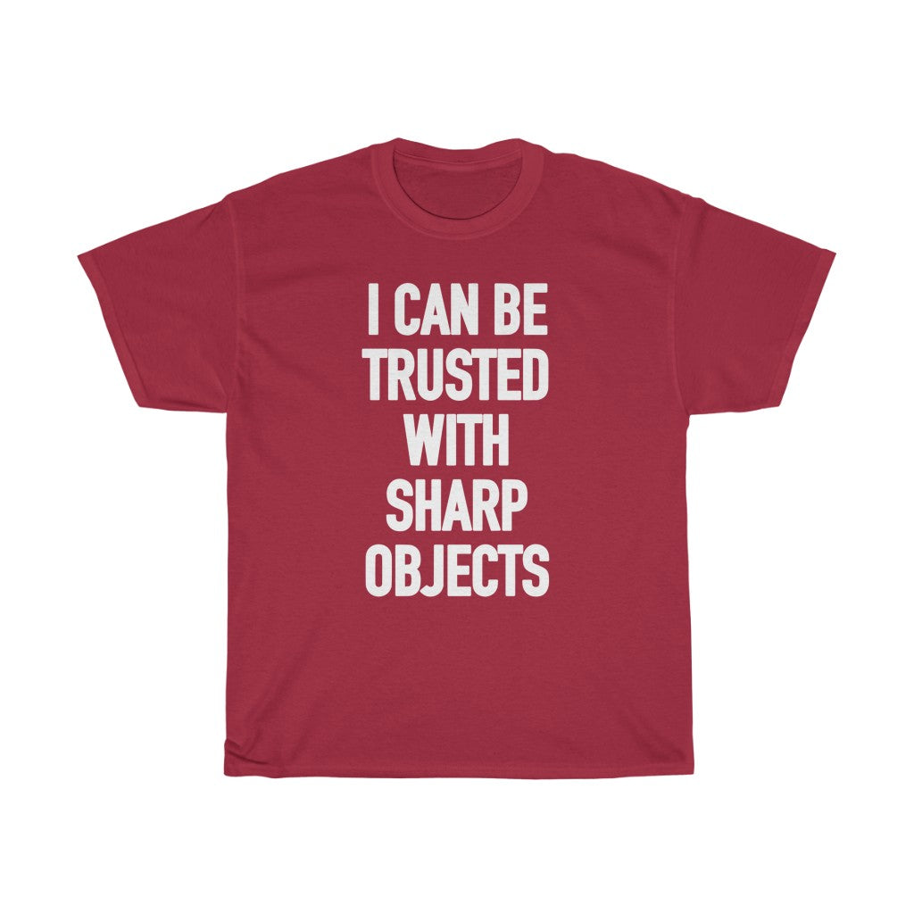 Embrace the humor with our 'I Can Be Trusted with Sharp Objects' tee, a hit among those searching for witty shirts and quirky confidence. Perfect for chefs, DIY enthusiasts, and anyone with a sharp wit and a penchant for humor. Add this conversation-starting piece to your collection and showcase your playful edge!